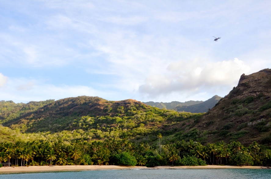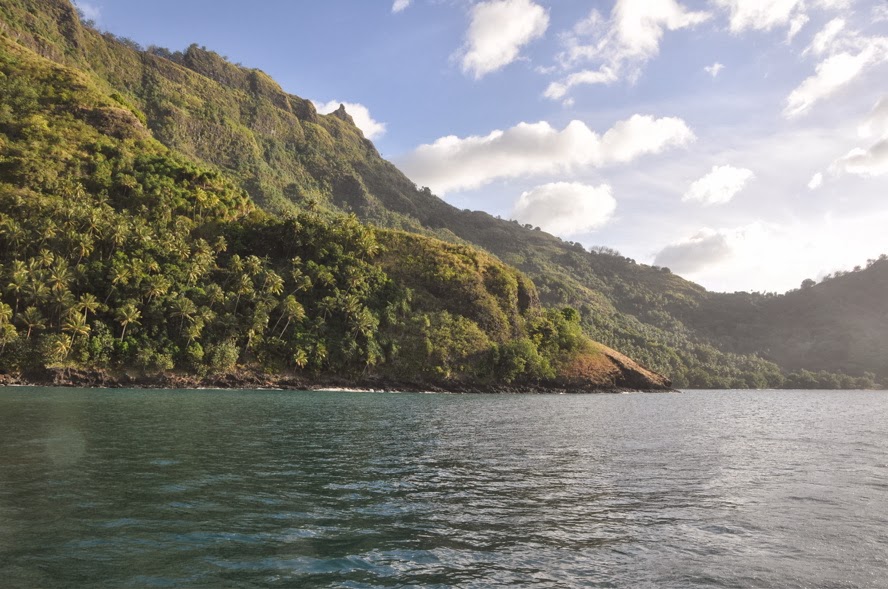 The fish wasn’t there, but the vistas were. Once more, vertigineous cliffs jutted straight from the surface of the ocean, cut by occasional verdant valleys planted with coconuts. Here and there, a palm-thatched roof appeared, flanked with the white snowball of a tiarè or tipanier.